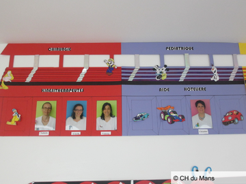 Le trombinoscope représente le circuit des 24 heures du Mans, en référence à une spécificité locale forte. Sur le circuit, 3 chenilles colorées représentant les chirurgiens, les infirmières et les auxiliaires de puériculture. Dans les paddocks (sous les gradins), les kinésithérapeutes, l’aide hôtelière, les secrétaires, l’institutrice. Les informations sont simples et compréhensibles : il est aisé de repérer les différents types de professionnels grâce à des codes couleur et une légende (les feuilles de l’arbre), les photos sont grandes donc visibles même si certaines sont situées en hauteur. Le trombinoscope est facilement adaptable selon les mouvements de personnel.